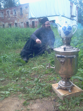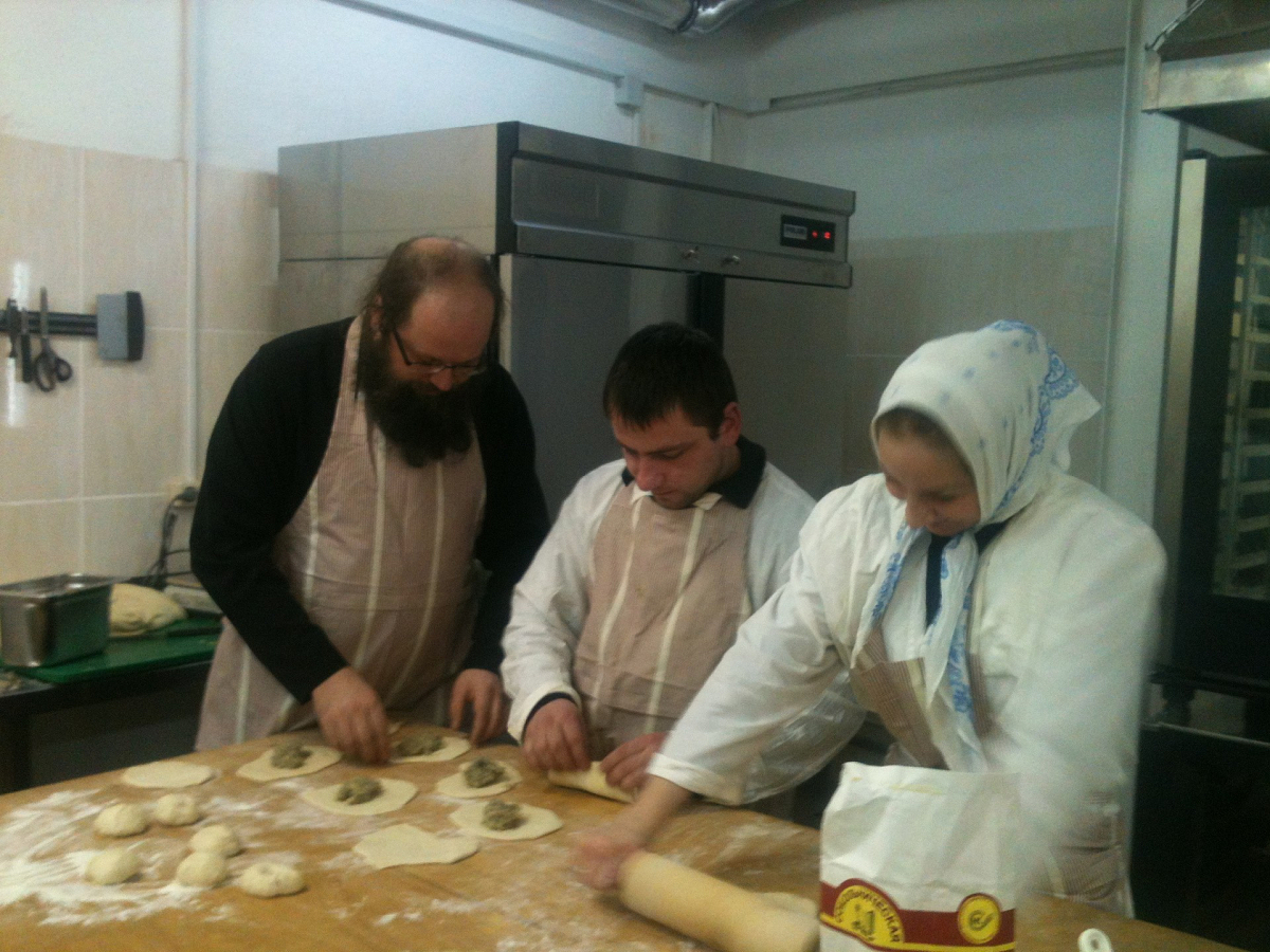 Отца Серафима отличает завидный оптимизм, искрометный юмор, беседа с ним – радость. Он прекрасный рассказчик, знаток во многих вопросах, увлекается военной историей. А в этот раз, приехав на подворье, мы застали отца Серафима в пекарне: он готовил начинку для пирогов. Подворье выживает как может, на все нужды средств не хватает. Но, по словам отца Серафима, надо довольствоваться малым, а если чего-то появится больше, то и радость будет вдвойне. Начинки для пирогов игумен кладет не жалея, с избытком. В настоящее время подворские пироги пользуются популярностью: съел один – и сыт на полдня.