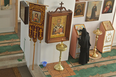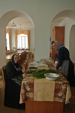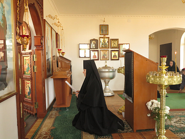 Возрождается и монашеская жизнь обители. Пока здесь живет всего пять сестер во главе с матушкой – игуменией Митрофанией (Миколко). День сестер начинается с молитвы и кончается молитвой. Утреннее и вечернее правило насельницы читают вместе. Литургия в монастыре служится два раза в неделю. Все сестры обучены уставу, поэтому, когда нет Литургии, чередная сестра после утреннего правила читает службу мирским чином, а остальные идут на послушания – на кухню и на коровник: в хозяйстве есть две коровы, теленок и куры. Общая же канва дня такова: подъем, утренние молитвы, служба, завтрак, послушания, обед, чтение кафизм, послушания, вечерняя служба, чай, вечернее молитвенное правило, отбой. В монастыре читается Псалтирь, и за каждой сестрой закреплены определенные кафизмы, которые она читает в назначенные для этого часы.