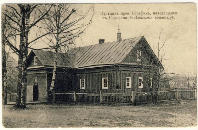 Далее нас провели к перенесенной сюда лесной келейке отца Серафима. В ней он прожил одиноко в глуши леса целый ряд лет, совершая свой подвиг затворничества. Простой деревянный сруб, потемневший от времени и непогод, охранялся теперь, как в футляре, в другой, более обширной постройке, а в образовавшемся вокруг коридоре в витринах выставлены платье и вещи подвижника. Самый домик-пустынька состоит из крошечных сеней и крошечной комнатки, где помещены большой портрет отца Серафима в черной полумантии и клобуке, чрезвычайно жизненный; портрет отца Серафима в гробу и несколько икон. Хорошо войти сюда, в эту, в буквальном смысле слова, благоухающую каким-то сладостным благоуханием постройку. Когда нет никого в ней и слышен только шепот псалтирных слов, хорошо взять в руки свечу и, наводя свет на лик старца, долго-долго смотреть на него, как на живого. Здесь обыкновенно, в память обычая старца, раздают богомольцам сухарики.