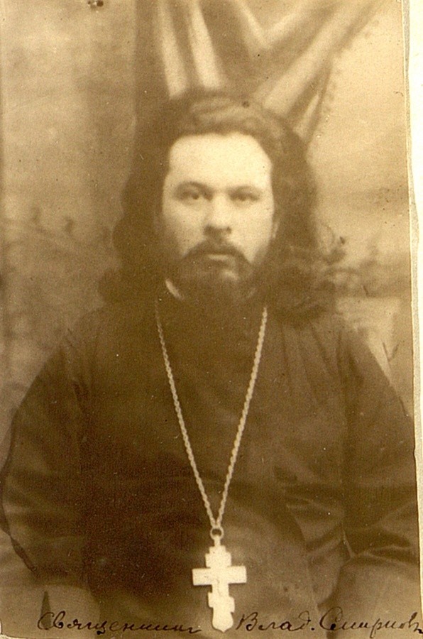В Яропольце, затем и на монастырском хуторе Чернецово, где отец Владимир служил с 1907 по 1922 годы, мне довелось быть свидетелем того, с каким горячим интересом монахиня Тавифа расспрашивала людей, способных сообщить что-либо о той эпохе, и чутким сердцем откликалась на те или иные факты из жизни новомученика. Обсуждая со священником Михаилом Завитаевым судимость отца Владимира по статье 74.ч.2 УК, мать Тавифа взволнованно и в то же время твердо сказала: «Батюшка был законоучителем в церковно-приходской школе на нашем монастырском хуторе и преподавал в двух земских училищах по соседству. Его супруга, матушка Александра, родная сестра нашего новомученика отца Алексия Скорцова, с материнской любовью занималась в школе с девочками рукоделием. Своих детей у них не было, но они стали крестными родителями племянников. Они любили детей всей душой, и обвинение "попа Смирнова", якобы избивавшего школьников, отражает степень ненависти богоборцев к духовенству».