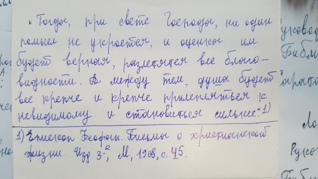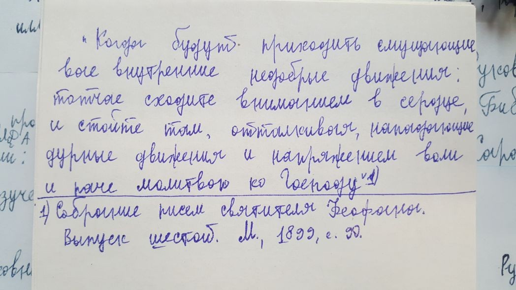 В этот день духовные чада отца Георгия дали мне прикоснуться к небольшим листкам бумаги, на которых отец Георгий четким ровным почерком многие годы делал выписки из творений святителя Феофана и которые потом использовал в своих научных работах и проповедях. Это было незабываемое ощущение прикосновения к Вечности…