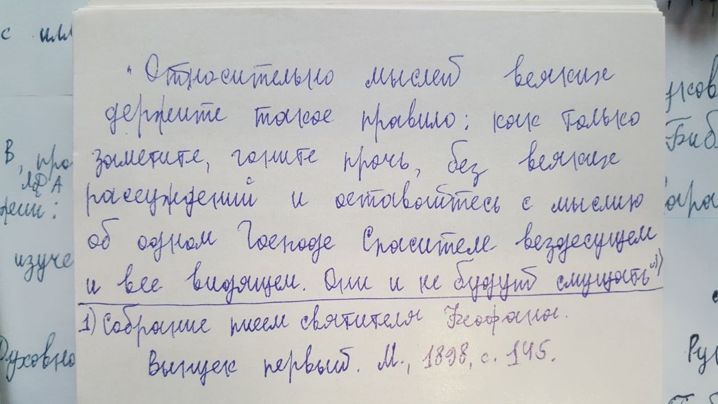 Относительно мыслей всяких держите такое правило: как только заметите, гоните прочь, без всяких рассуждений и оставайтесь с мыслию об одном Господе Спасителе вездесущем и все видящем. Они и не будут смущать.