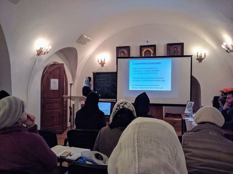 Кандидат исторических наук Дмитрий Давиденко в своем докладе «Подготовка новой редакции жития старицы Досифеи по архивным источникам» подробно рассказал о находках, большая часть которых пришлась на вторую половину 2019 года. Членам Досифеевской рабочей группы пришлось немало часов провести в Центральном Государственном архиве Москвы и в отделе рукописей Российской Государственной библиотеки. Сестры обители, монахиня Тавифа (Исаева) – руководитель группы – и инокиня Софрония (Адвахова), съездили в командировку Саранск, где в Центральном государственном архиве Республики Мордовия нашли очень интересные материалы. Также кропотливая поисковая работа велась в архивных фондах Новоспасского монастыря и Оптиной пустыни. В целом было выявлено 10 документов (как прижизненных, так и посмертных), в которых упоминается старица. О чьей кончине, добавил Дмитрий Григорьевич, на следующий день, 5 февраля 1810 года, узнала вся православная Москва – настолько велико было ее почитание! (Почему подвижница хотела быть упокоенной в Московском Новоспасском монастыре, было подробно изложено во втором докладе Д.Г. Давиденко: «Почитание старицы Досифеи в XІX – начале XX в. и церковно-археологические памятники Московского Новоспасского монастыря». (Кстати, именно он, историк-архивариус, нашел документальное подтверждение, что монахиня Досифея – это не какая-нибудь выдуманная легендарная личность, а реальный человек, живший в XIX веке. И нашел он это подтверждение в книге записей Новоспасского монастыря о погребении монахини Досифеи). Если говорить о результате работы участников вышеназванной группы, то, во-первых, была составлена историческая справка – своего рода документальное повествование о старице Досифее. Во-вторых, появилась новая литературная редакция ее жития.
