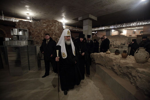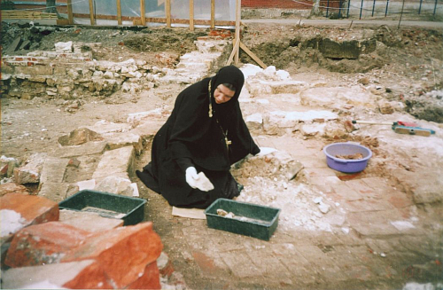 Молитвами преподобных матушек Господь сделал возможным переход к следующему важному этапу в жизни монастыря – воссозданию монастырского собора. К концу 2002 года было получено разрешение разобрать школьное здание на месте взорванного соборного храма Рождества Пресвятой Богородицы. Археологические изыскания на освободившейся площади начались весной 2003-го и проходили в течение пяти лет, ознаменовавшись замечательными находками. Раскопки позволили многое узнать о ранней истории обители; обнаруженные фундаменты древних храмов стали основой для оформления особого подземного пространства под собором и устройства церковно-исторического музея.