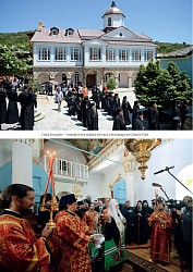 После этого Его Святейшество направился в обитель своих соотечественников – Русский на Афоне Свято-Пантелеимонов монастырь, отмечающий в этом году свое 1000-летие. О прибытии Предстоятеля Русской Церкви в русскую обитель возвестил торжественный колокольный звон. Путь Святейшего Патриарха от врат монастыря к соборному храму был устлан лавровыми ветвями. Патриарх Кирилл совершил молебен всем русским подвижникам, просиявшим на Святой Горе, и поблагодарил всех, кто помог возродить Пантелеимонову обитель.