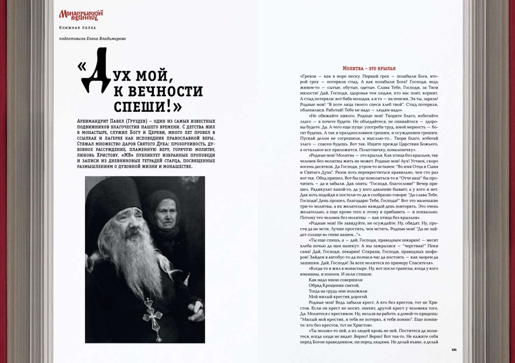 Архимандрит Павел (Груздев) – один из самых известных подвижников благочестия нашего времени. С детства жил в монастыре, служил Богу и Церкви, много лет провел в ссылках и лагерях как исповедник православной веры. Стяжал множество даров Святого Духа: прозорливость, духовное рассуждение, пламенную веру, горячую молитву, любовь Христову. «МВ» публикует избранные проповеди и записи из дневниковых тетрадей старца, посвященные размышлениям о духовной жизни и монашестве.