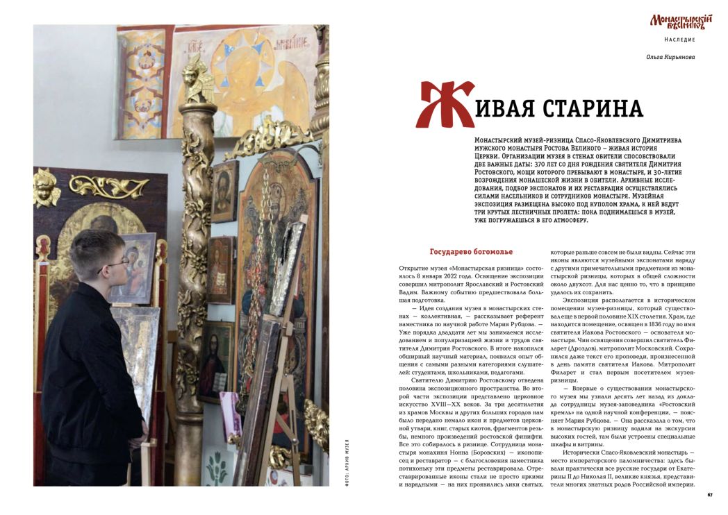 Монастырский музей-ризница Спасо-Яковлевского Димитриева мужского монастыря Ростова Великого – живая история Церкви. Организации музея в стенах обители способствовали две важные даты: 370 лет со дня рождения святителя Димитрия Ростовского, мощи которого пребывают в монастыре, и 30-летие возрождения монашеской жизни в обители. Архивные исследования, подбор экспонатов и их реставрация осуществлялись силами насельников и сотрудников монастыря. Музейная экспозиция размещена высоко под куполом храма, к ней ведут три крутых лестничных пролета: пока поднимаешься в музей, уже погружаешься в его атмосферу. Статья Ольги Кирьяновой.