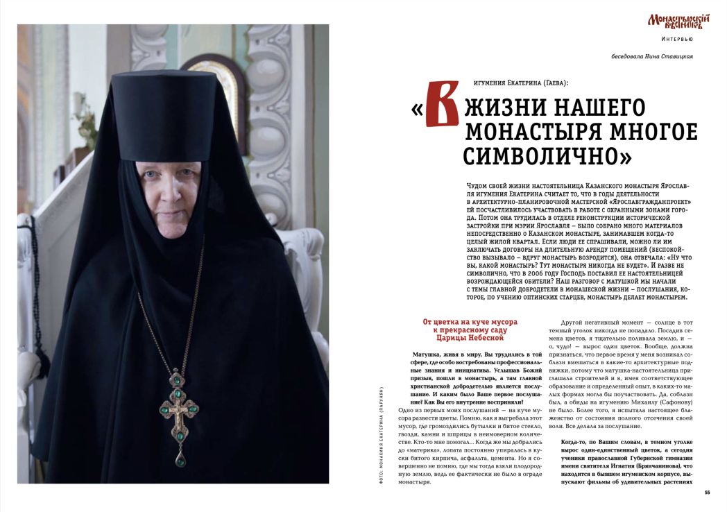 Чудом своей жизни настоятельница Казанского монастыря Ярославля игумения Екатерина считает то, что в годы деятельности в архитектурно-планировочной мастерской «Ярославгражданпроект» ей посчастливилось участвовать в работе с охранными зонами города. Потом она трудилась в отделе реконструкции исторической застройки при мэрии Ярославля – было собрано много материалов непосредственно о Казанском монастыре, занимавшем когда-то целый жилой квартал. Если люди ее спрашивали, можно ли им заключать договоры на длительную аренду помещений (беспокойство вызывало – вдруг монастырь возродится), она отвечала: «Ну что вы, какой монастырь? Тут монастыря никогда не будет». И разве не символично, что в 2006 году Господь поставил ее настоятельницей возрождающейся обители? В беседе с Ниной Ставицкой матушка Екатерина среди прочего рассказала о главной добродетели в монашеской жизни – послушании, которое, по учению оптинских старцев, монастырь делает монастырем.