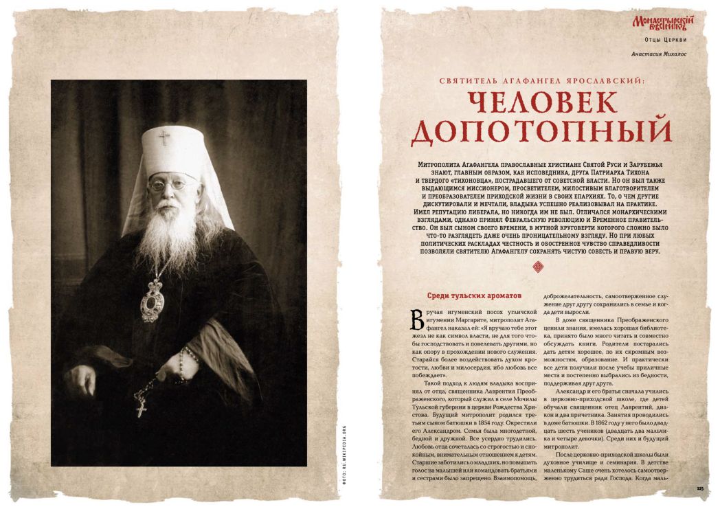 Митрополита Агафангела православные христиане Святой Руси и Зарубежья знают, главным образом, как исповедника, друга Патриарха Тихона и твердого «тихоновца», пострадавшего от советской власти. Но он был также выдающимся миссионером, просветителем, милостивым благотворителем и преобразователем приходской жизни в своих епархиях. То, о чем другие дискутировали и мечтали, владыка успешно реализовывал на практике. Имел репутацию либерала, но никогда им не был. Отличался монархическими взглядами, однако принял Февральскую революцию и Временное правительство. Он был сыном своего времени, в мутной круговерти которого сложно было что-то разглядеть даже очень проницательному взгляду. Но при любых политических раскладах честность и обостренное чувство справедливости позволяли святителю Агафангелу сохранять чистую совесть и правую веру. Материал постоянного автора «МВ» Анастасии Михалос.