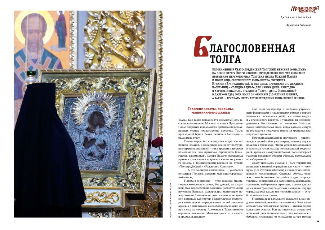 Белокаменный Свято-Введенский Толгский женский монастырь на левом берегу Волги известен прежде всего тем, что в обители пребывают нерукотворная Толгская икона Божией Матери и мощи отца современного монашества святителя Игнатия (Брянчанинова). А еще здесь проживает сто двадцать насельниц – солидная цифра для наших дней. Ежегодно в августе монастырь празднует Толгин день. Основанный в далеком 1314 году, ныне он отмечает 710-летний юбилей, а также – тридцать шесть лет возрождения монашеской жизни. Репортаж Христины Поляковой.