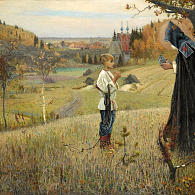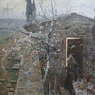 Василий Максимов (1844–1911) принадлежал к когорте передвижников и тоже изображал «правду жизни» (в которую, кстати, несмотря ни на что, порой прорывается нечто большее, и в которой есть своя красота). В его работе «У ограды скита» первое, что привлекает внимание, – врата, контрастно написанные, а потому сразу зрительно читающиеся. И – лестница вверх, то есть вход и путь. Путь к свету, пробивающемуся там, наверху. И только потом уже взгляд обращается на фигуры людей: это пожилой монах у входа, встречающий мирянина, который делает шаг ему навстречу, и другой монах на лестнице. В данном случае художник не стремится показать истории конкретных героев – те словно растворяются в окружающем; более важным оказывается сама идея пути вверх, его возможности. В работе очень много зеленого – цвета жизни, причем не той, будничной, что осталась за рамками изобразительного пространства...