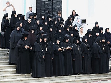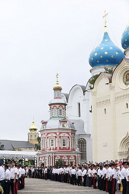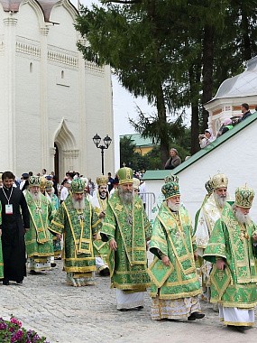 Святейший Патриарх Московский и всея Руси Кирилл возглавил служение праздничной Литургии на Соборной площади обители. Богослужение совершалось перед престолом, установленном на помосте с сенью у врат Успенского собора.