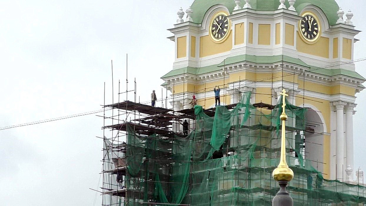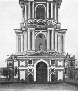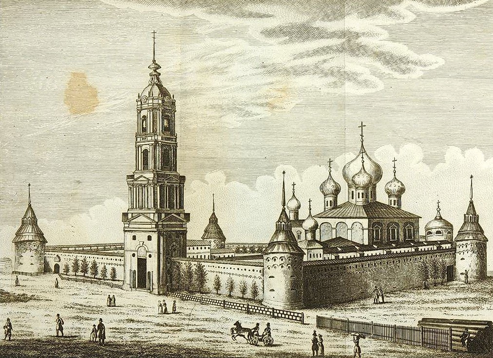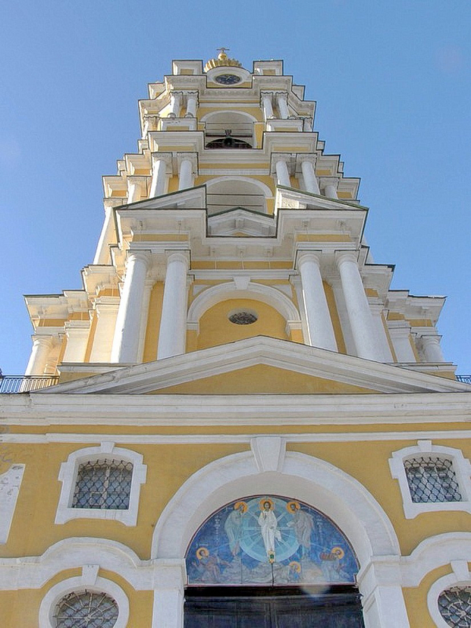 Однако в те годы удалось возвести только два яруса: нижний арочный проезд – Святые врата, и второй этаж, тот самый, где должна была разместиться церковь; после чего строительство на долгие годы было заморожено. Оно возобновилось в 1782 году, когда по настоятельному ходатайству архимандрита Иоасафа (Маслова) (настоятеля в 1779–1785 годах) из государственной казны на завершение колокольни монастырю было выделено 20 000 руб. [10, с. 449–451].