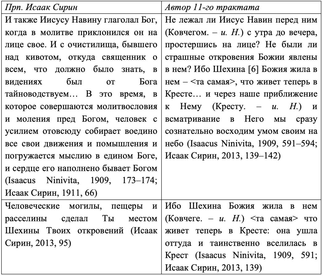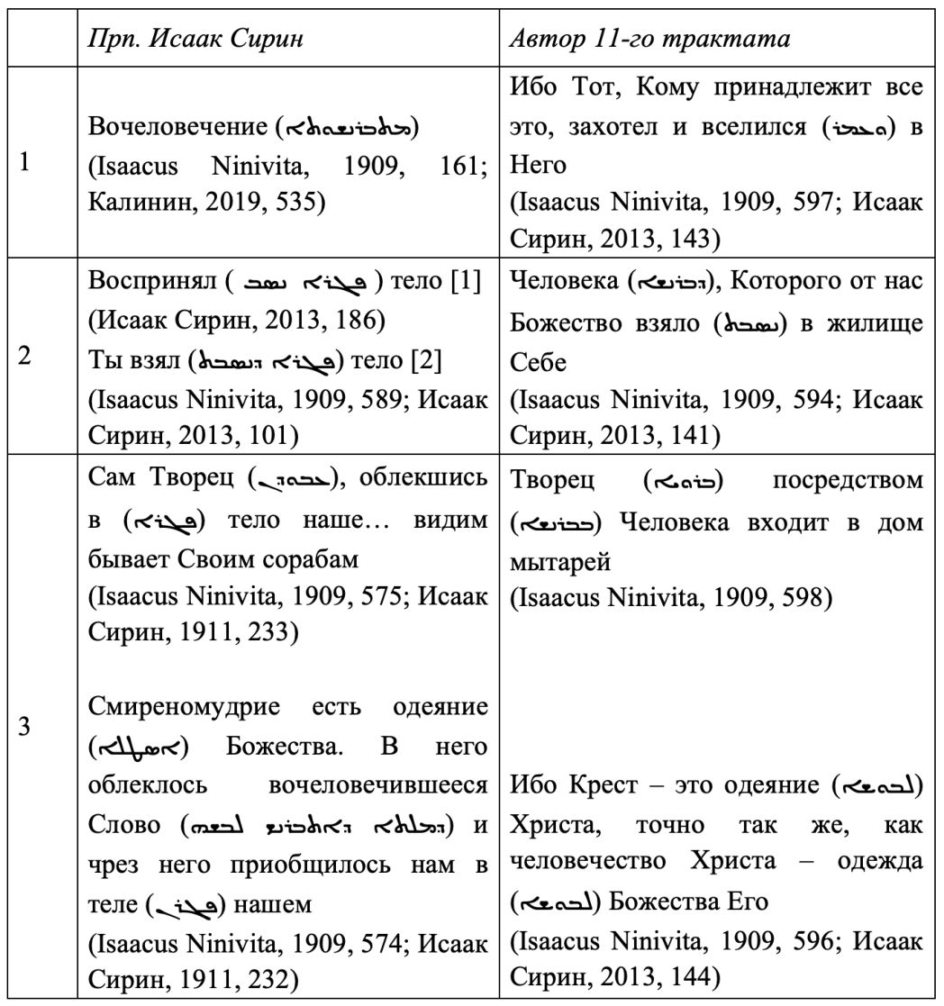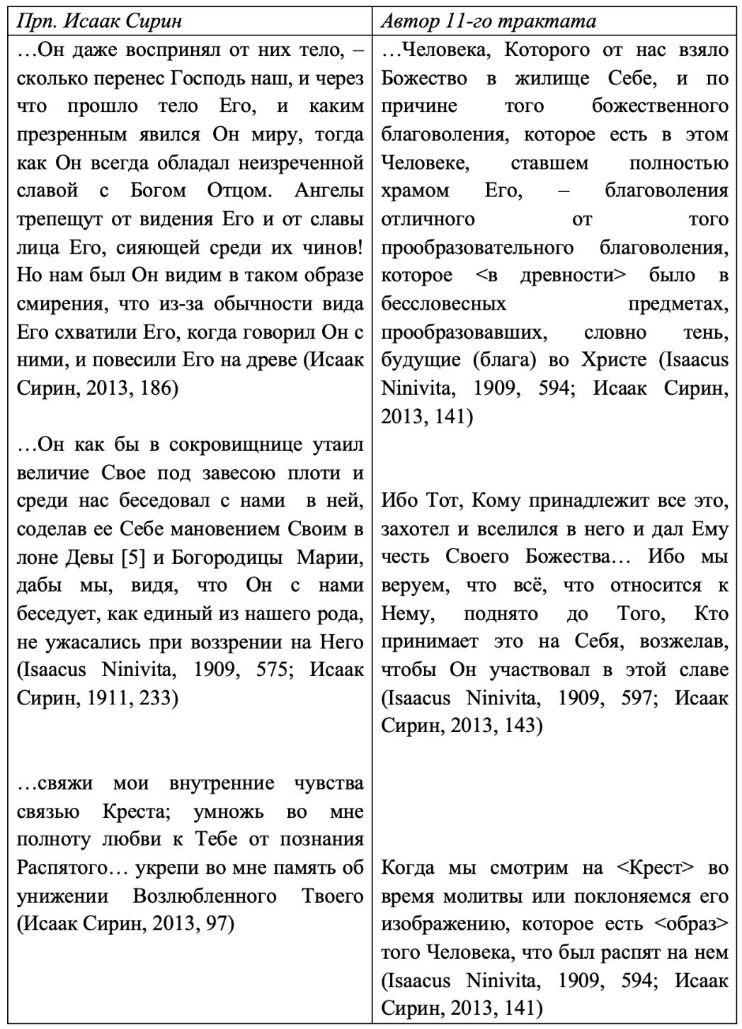 Для полноты картины остается представить стилистические отличия языка прп. Исаака и автора 11-го трактата. Впрочем, издатели 2-го Собрания сами признаются, что христологический язык 11-го трактата «соответствует восточно-сирийской терминологии» (см.: (Исаак Сирин, 2013, 147, прим. 25)). Стилистика 11-го трактата во многом отличается от стилистики прп. Исаака, но мы ограничимся теми фрагментами, в которых присутствуют одновременно тема Крестных страданий и Боговоплощения. Каждый автор следует своей указанной выше богословской позиции (см. таблицу 3).