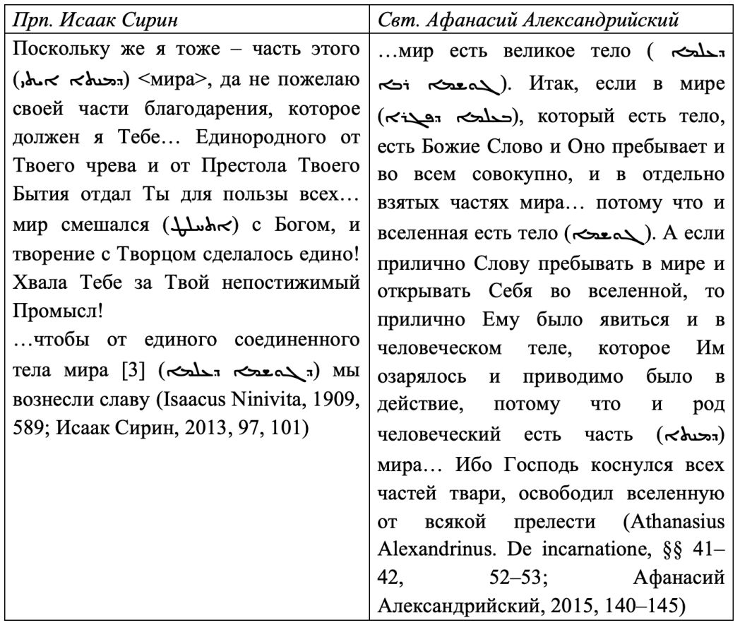 Приведем сравнительно еще один богословский топос, обнаруживающийся в писаниях обоих указанных авторов (см. таблицу 2). Выражение «тело мира» (ܕܓܘܫܡܗ ܕܥܠܡܐ) снова отсылает нас напрямую к богословию свт. Афанасия Александрийского (AthanasiusAlexandrinus. De incarnatione, § 41, 52; Афанасий Александрийский, 2015, 140–141, 247, 297) и к выводимому из него учению о том, что человеческий род есть часть этого мира и что благодаря Вочеловечению Слова мир соединился с Творцом.