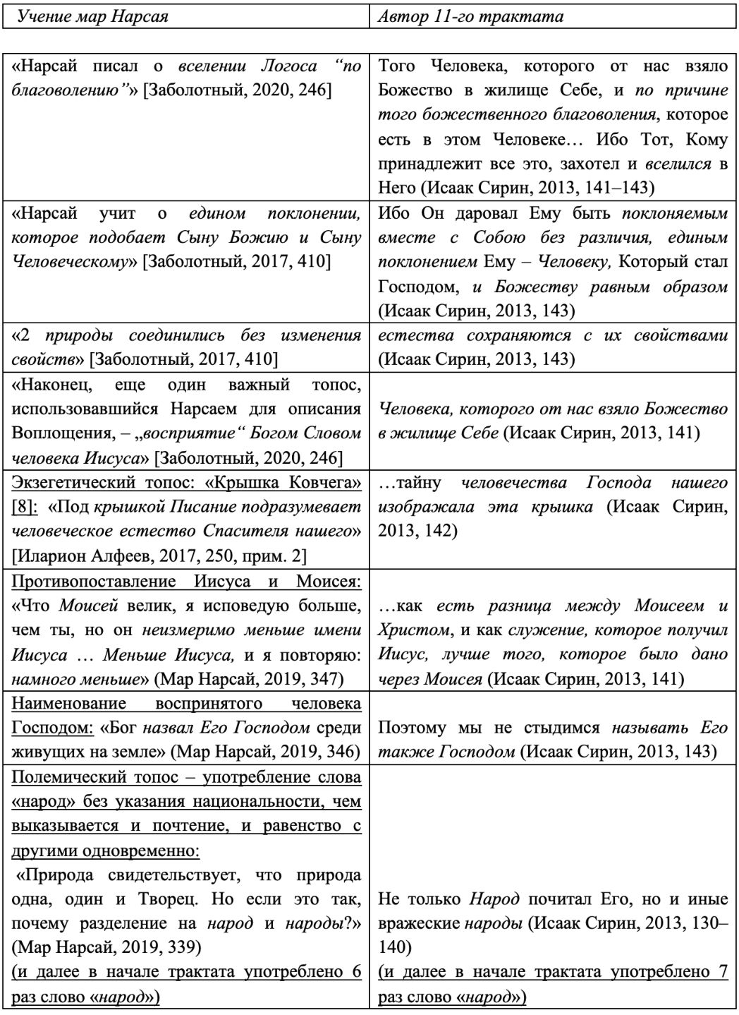 11-й трактат содержит элементы антииудейской полемики, которая имела место в восточно-сирийской литературе VI–VII вв. (см.: (Исаак Сирин, 2013, 146, прим. 22)), подобная тематика чужда текстам преподобного Исаака. Интересно отметить, что антииудейские трактаты писал несторианский богослов Нарсай, его христологические взгляды практически совпадают с двухсубъектной христологией автора 11-го трактата. Как отмечают некоторые исследователи, «Нарсай не переступил грань, за которой должно было следовать признание двух субъектов во Христе, хотя вплотную подошел к ней» [Заболотный, 2020, 244]. Тем не менее, Нарсай, «следуя строгому дифизитству Феодора Мопсуестийского, различал две конкретные, индивидуализированные природы – второй Ипостаси (см.: [Заболотный, 2017, 410]). Отсюда вытекает сложная богословская артикуляция (чуждая поэтическому языку прп. Исаака), которую можно наблюдать у автора 11-го трактата, его мысль стоит на грани между «феодорианством» и «несторианством» [7]. Сопоставив учение Нарсая с учением автора 11-го трактата, мы обнаружили, как минимум, 8 точек пересечения. Представим их в таблице, курсивом выделим параллели, подчеркиванием – наши пояснительные ремарки (см. таблицу 5).