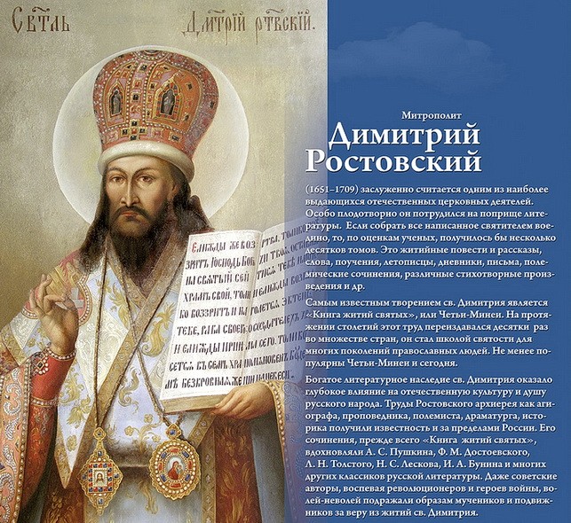 Святителя Димитрия по праву считают одним из самых влиятельных воспитателей светлых и гуманных черт русского национального характера. Искреннее желание сделать людей лучше и чище, доброе сердце, всегда готовое откликнуться на чужую беду, совершенное нестяжательство, скромность и непрестанная молитва – таким был святитель Димитрий. Эти драгоценные черты внутреннего облика отражаются в его творчестве, они притягивают сердца читателей и оставляют в них свой след. Так было в России прошлом, так может стать и теперь.