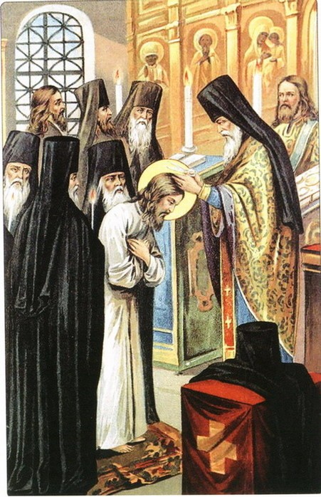 Игумен молится о нем, вспоминая благоутробие Щедрого Бога, сказавшего Израилю: "Аще бы и жена забыла исчадие свое, Аз не забуду тебе"; укрепляет дух нового брата обетованием Небесной силы в подвигах духовных и утешения Святого Духа и части святых Антония, Евфимия, Саввы и сущих с ними во Христе Иисусе.
