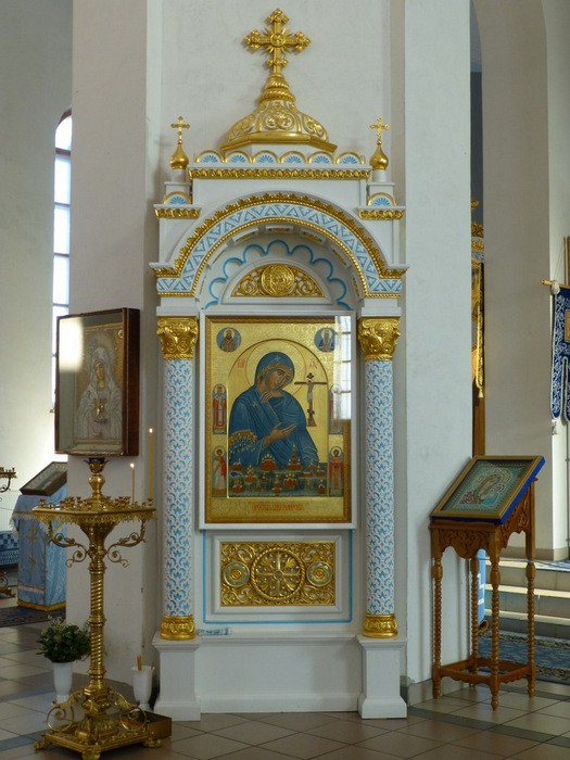 У граней массивных колон в напольных кивотах помещены Богородичные иконы : «Ачаирская», «Успение», «Всецарица», «Взыскание погибших».