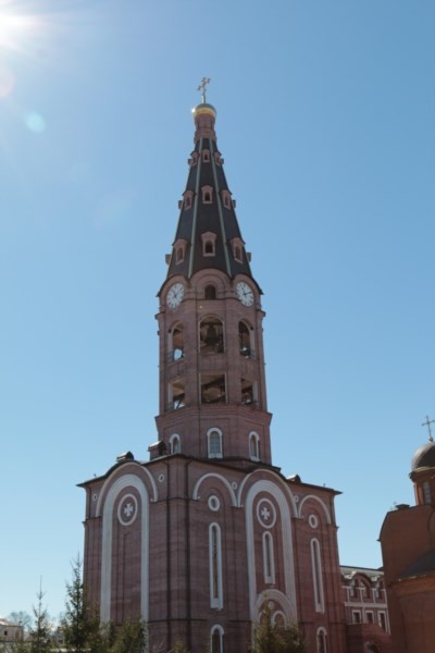 Высокая колокольня напоминает башни Московского Кремля, знаменитого храма Вознесения в Государственном историко-архитектурном музее-заповеднике «Коломенское» и других старинных храмов и колоколен. Высота колокольни - 83 метра. Главный вход в монастырь проходит через Святые Врата, расположенные в первом ярусе колокольни. Здесь же размещена еще одна иконная лавка. Стены колокольни отделаны особым кирпичом, имеющим розовый оттенок, и украшены декоративными элементами из белого мрамора. Медный, с золотыми ребрами, шатер венчается золотым куполом с крестом. Помимо традиционных лестниц в колокольне есть лифт, на котором можно подняться с первого на пятый ярус. На высоте 41,7 м установлены механические куранты с циферблатами, выходящими на 4 стороны здания. Диаметр циферблата равен трем метрам. На 2 этаже звона 18 колоколов расположены в 4 яруса, два самые большие из которых имеют массу 8,6 т и 18 т (язык этого гиганта весит 900 кг).