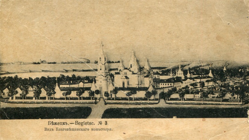 Благовещенский женский монастырь основан попечением иеромонаха Югской пустыни Адриана, угличского священника Петра Томаницкого и вдовы Любови Ососковой на пожертвования бежецких купцов. Открыт в 1868г. как женская община, статус монастыря получил в 1879г. В 1870-1890гг. при помощи отца Иоанна Кронштадского на средства благотворителей построены каменные келейные корпуса. В 1885г. многоярусная надвратная колокольня и ограда с башнями.