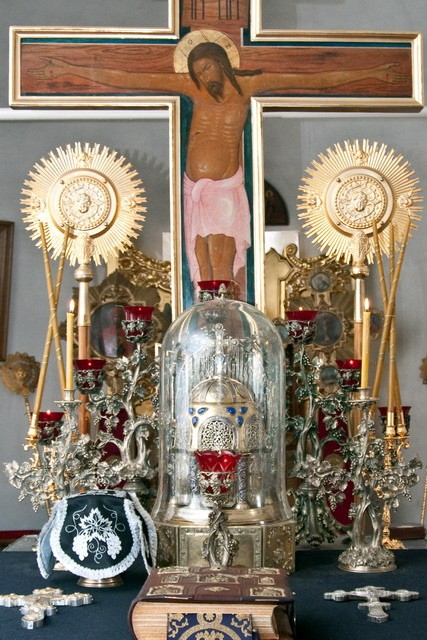 Святыни храма: особо почитаемая икона апостола . Иоанна Богослова и ковчеги с частицами святых мощей Киево-Печерских преподобных отцов и местночтимых святых Мордовии