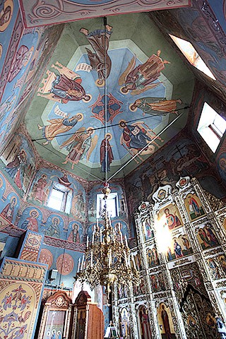 Иконостас не интересный, поздний; живописи по стенам нет. Внутри церковь окрашена в темно-серый тон масляной краской.