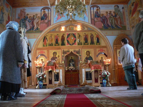 Внутреннее убранство – три резных деревянных иконостаса с писаными иконами, два резных деревянных клироса, писаные иконы в резных киотах.