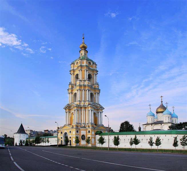 Первая колокольня монастыря была сооружена в начале XVII века на средства Патриарха Филарета Никитича справа от Спасо-Преображенского собора близ церкви Знамения. Это была шатровая колокольня, на ней были устроены часы боевые, колокол боевой, да два колокола перечастных». В колокольне Патриарх устроил храм во имя преподобного Саввы Освященного, поскольку в день преподобного Саввы Освященного, 5 декабря 1618 года, будущий Патриарх Филарет был освобождён из польского плена. Наличие часов сближает старую колокольню с современной, которая была заложена в царствование императрицы Елизаветы Петровны на восточной стороне ограды. Колокольня была построена в 1759-1785 году. Автором проекта колокольни стал зодчий Иван Жеребцов, наиболее известный из учеников архитектора Евлашева. После смерти он был погребён в первом ярусе колокольни. В конце 50-х годов XVIII века были построены первый и второй этажи колокольни, затем её постройка была приостановлена из-за нехватки средств вследствие проведённой императрицей Екатериной II секуляризации церковного имущества. Лишь через 20 лет при поддержке императрицы Екатерины II постройка колокольни была возобновлена. Тогда же были надстроены 3 и 4 ярусы. Её глава была позолочена на средства московского купца Васильева. Вся постройка обошлась в 80 000 рублей — сумму, по тем временам внушительную. Высота колокольни до главы 80,41 метра. По высоте она немного уступает колокольне Ивана Великого в Кремле, высота которой 81 метр. Колокольня украшена фронтонами, колоннами, декоративными чашами. Во втором ярусе колокольни находится храм во имя святого преподобного Сергия Радонежского. Этот храм устроен в 1787 году на средства купеческой вдовы Наталии Бабкиной. В 1812 году в храме выгорело всё, что было деревянного. Каменные своды храма обрушились вследствие падения на них большого колокола весом 1100 пудов и полуелейного колокола в 425 пудов. В 1816 году своды храма были заделаны, оштукатурены и на частные пожертвования установлен новый иконостас. Все иконы, находящиеся в иконостасе, принадлежат кисти итальянских мастеров. Из храма Преподобного Сергия можно попасть на террасу, которая устроена на втором ярусе колокольни. В четвёртом ярусе расположены колокола. На верху устроены часы с боем, исполняющее мелодию каждые полчаса. В основании колокольни расположены главные ворота монастыря.