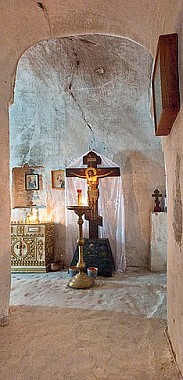 Над входом в пещерный храм в честь Нерукотворного Образа Спаса возвышаются величественные меловые дивы, напоминающие башни древних монастырей. Главный престол этого храма считается самым древним. Он освящен в честь Спаса Нерукотворного. Его предел в честь мучениц . Веры, Надежды, Любови и матери их Софии был построен значительно позже русскими подвижниками, вдохновленными древними пещеростроителями. Известно, что вход в храм был хорошо укреплен, о чем свидетельствуют следы от массивных двойных ворот, имелся запасной выход и колодец. Очевидно, в свое время пещеры собора служили также укрытием от кочевников и других неприятелей, совершавших опустошительные набеги на эти земли до второй трети XVII века.