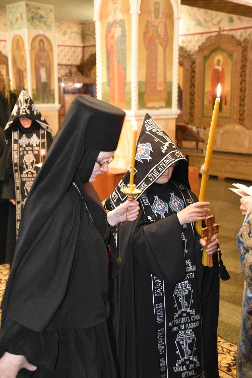 К концу 1990 г. московским художником Алексеем Семеновичем Россаль-Вороновым была выполнена работа по росписи нового храма. 9 декабря 1990 года Преосвященнейшим Антонием (Черемисовым), епископом Красноярским и Енисейским, перед Божественной Литургией было совершено великое освящение нижнего придела монастырского храма. Верхний, покровский придел монастырского храма был освящён великим чином лишь 7 апреля 2009 года. В 1992 году протоиерей Сергий Плаксин обратился с письменным прошением на имя Преосвященнейшего Антония, епископа Красноярского и Енисейского, в то время управляющего православными приходами Кемеровской области о благословении на преобразование Покровского прихода в женский монастырь и избрание из числа сестер игумении. 19 января 1992 года епископом Антонием прошение было рассмотрено и одобрено. Официально женский монастырь на территории прихода Покровской церкви был учрежден по благословению Святейшего Патриарха Московского и всея Руси Алексия II и Постановлению Святейшего Синода Русской Православной Церкви от 3 апреля 1992 года, а также на основании Указа Преосвященнейшего епископа Красноярского и Енисейского от 4 апреля 1992 года. Исполняющей обязанности настоятельницы обители была назначена монахиня Сергия (Каношина). Постриги первых сестер будущей обители и организацию монастыря благословлял схиархимандрит Виталий (Сидоренко) – духовный наставник основателя обители о. Сергия Плаксина. Схиархимандрит Виталий (Сидоренко) был постриженником Глинской пустыни и духовным чадом иеросхимонаха Серафима (Романцова). После монахини Сергии управление обителью приняла монахиня Мария (Шнуровозова). Новая настоятельница вступила в должность 15 октября 1994 года. Матушка Мария пробыла настоятельницей более 10 лет. Затем, менее года делами обители управляла монахиня Иакова (Гребнева), которую сменила монахиня Анфира (Ган), пробывшая настоятельницей также недолго.