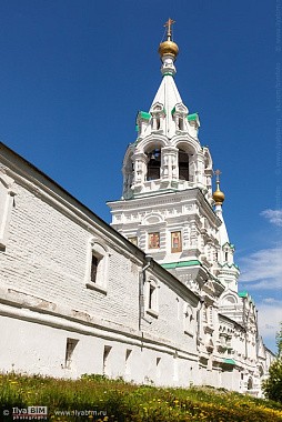 В 1648—1652 годах в южной части монастыря на одном фундаменте были построены надвратная шатровая церковь во имя Казанской иконы Божией Матери и прорезная многоярусная колокольня.