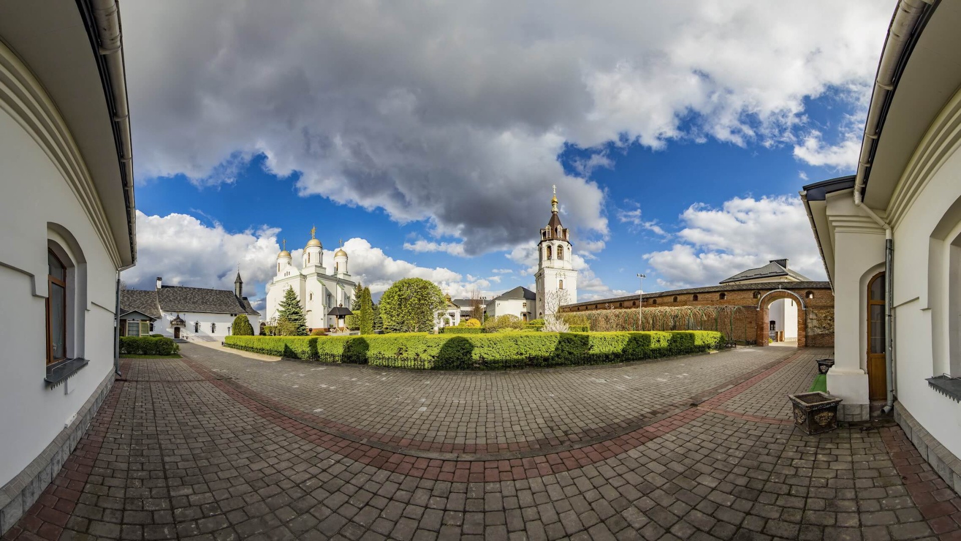 Территория монастыря, окруженная крепостными стенами с башнями, приближается в плане к прямоугольнику, вытянутому с запада на восток. При этом северная сторона прямоугольника совпадает с верхней границей склона левого берега р. Луга. В северо-восточном углу монастыря в 2001 г. установлен памятник св. равноап. князю Владимиру (по случаю празднования 1000-летия монастыря). В центре северной стороны монастырского прямоугольника, вместо части крепостной стены, расположен Успенский храм. У юго-западного угла храма расположена деревянная колокольня с единственным колоколом, отлитым для обители Чарторыйским. У небольшого свободного пространства перед западным торцом Успенского храма у северо-западной угловой башни расположен корпус с церковью св. прав. Иулиании Ольшанской (в XIX веке его называли «теремом св. Владимира»). К западной крепостной стене, со стороны монастырского двора, пристроен одноэтажный сестринский корпус. В юго-западной части двора находится водосвятная часовня, возведенная к 2000-летию Рождества Христова. В центре южной крепостной стены, напротив Успенского храма, возвышается колокольня со святыми воротами в нижнем ярусе. На месте разобранной юго-восточной угловой части крепостной стены находится массивный двухэтажный дом дореволюционной школы, возведенный в 1890-х гг. Некоторые здания обители расположены вне основной территории. К северу от Успенского храма, на небольшой террасе посреди склона берега р. Луга, стоит Свято-Троицкая церковь. Немного южнее возведена подпорная стена, в западной половине которой находится лестница, ведущая от крепости к Свято-Троицкой церкви. В центре подпорной стены, напротив Свято-Троицкой церкви, устроен вход в пещеры, которые проходят под склоном над Лугой и под территорией монастыря. В пещерах находится церковь прп. Варлаама Печерского. С юго-западной стороны к основной территории обители пристроен большой огороженный двор с дополнительными постройками — жилыми и хозяйственными.