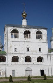 Первой построили каменную церковь во имя Воскресения Господня, затем церковь Одигитрии с трапезной палатой и часозвоней наверху, под которой находились большие стенные часы. Церковь Одигитрии соединялась с храмом Воскресения широким арочным переходом, над которым были возведены церковь Марии Египетской и звонница. Устройство звонницы несколько напоминает такие же постройки в Борисоглебском монастыре и в Кремле Ростова Великого. Однако это только видимое сходство. Звонница Воскресенского монастыря представляет собой синтез разных по назначению построек: в нижнем этаже (подклете) находились въездные и входные ворота, две широкие лестницы вели от него наверх, на галерею. Оттуда узким внутренним входом можно было пройти еще выше - в церковь Марии Египетской. Наконец, на четвертом ярусе, на массивных деревянных балках, находились колокола звонницы. Все это сооружение венчала небольшая главка, первоначально крытая зеленой поливной черепицей