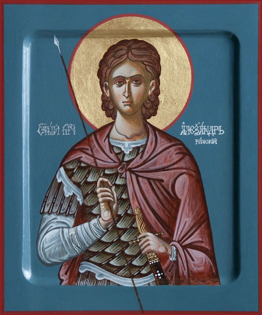 Святой мученик Александр пострадал за Христа в начале IV века. Он был военным, служил в полку трибуна Тивериана в Риме. Ему шел 18-й год, когда римской император Максимиан Геркул (284–305) издал приказ, чтобы все граждане в определенный день явились в загородный храм Зевса для принесения жертвы. Трибун Тивериан собрал своих воинов и приказал им идти на это празднество, но юноша Александр, с детства воспитанный в Христовой вере, отказался и объявил, что он не будет приносить жертву бесам. Тивериан, боясь за себя, донес императору Максимиану, что в его полку есть воин – христианин. За Александром сразу же были посланы воины. В это время Александр спал. Его разбудил Ангел, возвестивший юноше о предстоявшем ему мученическом подвиге и о том, что неотступно пребудет с ним во все время подвига. Когда воины пришли, Александр вышел к ним навстречу; лицо его сияло таким светом, что воины, взглянув на него, упали на землю. Святой ободрил их и просил выполнить данный им приказ. Представ перед Максимианом, святой Александр смело исповедал свою веру во Христа и отказался кланяться идолам, прибавив еще, что не страшится ни императора, ни его угроз. Император пробовал уговорить юношу обещанием почестей, но Александр остался твердым в своем исповедании и обличал императора и всех язычников. Начались истязания святого мученика, но он мужественно переносил страдания. Максимиан предал святого Александра во власть трибуна Тивериана, посланного императором во Фракию для мучения христиан. Мученика, скованного цепями, повели во Фракию. В это время Ангел Господень известил мать святого Александра Пимению о мученическом подвиге ее сына. Пимения нашла своего сына в городе Катаргене, где он предстал на суд перед Тиверианом и снова твердо исповедал себя христианином. Его подвергли истязаниям на глазах у матери, а затем связанного повели в дальнейший путь за колесницей Тивериана. Мужественная Пимения упросила воинов разрешить ей подойти к сыну и воодушевила его к перенесению мук за Христа. Воины удивлялись стойкости святого мученика и говорили друг другу: "Велик Бог христианский!". Мученику несколько раз являлся Ангел, укрепляя его силы. Ночью Тивериану явился грозный Ангел с мечом, повелевая трибуну поспешно идти в Византию, так как приблизилось уже время кончины святого мученика. Тивериан продолжал свой путь с поспешностью. В городе Филиппополе Тивериан устроил очередной суд над святым Александром в присутствии собранных по этому случаю городских вельмож. На этом суде святой Александр остался также непоколебимым. Во время своего скорбного пути святой мученик неоднократно подвергался жестоким истязаниям, но, укрепляемый Богом, перенес все муки и сам подкрепил изнемогших от жажды воинов, испросив у Господа для них источник воды. Во время остановки в пути святой мученик молился под деревом об укреплении его в страданиях; плоды и листья этого дерева получили целебную силу. У места, называемого Вуртодексион, святой вновь встретил свою мать Пимению, которая с рыданием упала к его ногам. Святой мученик сказал ей: "Не плачь, мать моя, утром следующего дня Господь поможет мне окончить подвиг". В городе Дризипере Тивериан вынес святому смертный приговор. Перед смертью святой мученик благодарил Господа за то, что Господь дал ему силы перенести все многочисленные ис