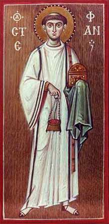 Подвигом добрым подвизался еси,/ первомучениче Христов, и апостоле, и архидиаконе Стефане,/ и мучителей обличил еси нечестие,/ камением бо побиен от рук беззаконных,/ венец от яже свыше десницы приял еси/ и к Богу взывал еси, вопия:// Господи, не постави им греха сего.Ин тропарь, глас 3