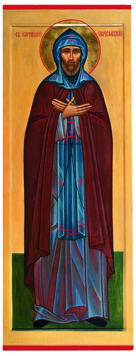 Преподобный Корнилий Переяславский, в мире Конон, был сыном рязанского купца. В юных летах ушел из родительского дома и пять лет прожил послушником у старца Павла в Лукьяновской пустыни, под Переяславом. Затем юный подвижник перешел в Переяславскую обитель святых Бориса и Глеба, что на Песках. Конон усердно ходил в храм и беспрекословно выполнял все, что ему приказывали. В трапезе святой послушник не садился с братией, но довольствовался тем, что оставалось, принимая пищу три раза в неделю. Через пять лет он принял иночество с именем Корнилий. С этого времени никто не видел преподобного спавшим на постели. Некоторые из братии насмехались над святым Корнилием, как юродивым, но преподобный молча переносил обиды и усиливал иноческие подвиги. Испросив у игумена разрешение жить в затворе, преподобный Корнилий затворился в выстроенной для него особой келлии и безвыходно подвизался в посте и молитве. Однажды братия нашла его едва живым: келлия преподобного была заперта изнутри. Три месяца преподобный Корнилий пролежал больным; он мог принимать только воду и сок. Выздоровев, преподобный, будучи убежден игуменом, остался жить с братией. Святой Корнилий был пономарем в храме, служил в трапезе, трудился в саду. Благодаря трудам преподобного в монастырском саду росли превосходные яблоки, которые он с любовью раздавал приходящим. От строгого поста тело преподобного Корнилия иссохло, но святой не переставал трудиться: своими руками он выкопал для братии колодец. Тридцать лет прожил преподобный Корнилий в полном безмолвии, считаясь у братии глухим и немым. Перед кончиною, последовавшей 22 июля 1693 года, преподобный Корнилий исповедался у духовника обители отца Варлаама, причастился Святых Таин и принял схиму. Преподобный был погребен в часовне. Через 9 лет при построении нового храма его мощи были обретены нетленными. В 1705 году святитель Димитрий, митрополит Ростовский (память 28 октября), свидетельствовал мощи преподобного Корнилия, и они были помещены в новом храме под спудом. Тогда же святитель Димитрий составил преподобному тропарь и кондак.