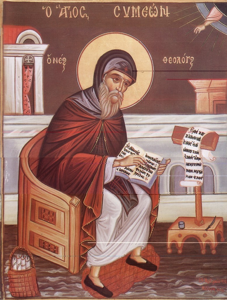 Около 1005 года преподобный Симеон передал игуменство Арсению, а сам поселился при монастыре на покое. Там он создал свои Богословские труды, отрывки из которых вошли в 5-й том "Добротолюбия". Главная тема его творения - сокровенное делание во Христе. Преподобный Симеон учит внутренней брани, способам духовного совершенствования, борьбе против страстей и греховных помыслов. Он написал поучения для монахов, "Деятельные Богословские главы", "Слово о трех образах молитвы", "Слово о вере". Кроме того, преподобный Симеон был выдающимся церковным поэтом. Ему принадлежат "Гимны Божественной любви" - около 70 поэм, полных глубоких молитвенных размышлений.