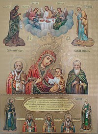 В описи Гжатского 3-классного Колочского мужского монастыря за 1860 г читаем: «В центральном Успенском приделе за правым клиросом в большом вызолоченном киоте с вызолоченными колоннами, резными фигурами и украшениями лучшей работы хранится Чудотворный Образ Божией Матери. На сей иконе в середине Божия Матерь с Предвечным Младенцем и предстоящими при Ней святителем Николаем и святым пророком Илиею. Вверху Святая Троица в виде ангелов, по правую сторону — Иоанн Предтеча, по левую – Симеон Богоприимец. Под ликом Божией Матери три Святителя: Василий Великий, Григорий Богослов и Иоанн Златоуст, по сторонам их — преподобные Авраамий Смоленский и Пафнутий Боровский чудотворцы». Икону украшала вызолоченная серебряная риза древней чеканной работы, вокруг – серебряная вызолоченная рамка, на которую была наложена ветхая золотая чеканной работы с эмалью сквозная сетка (кружево). Перед чудотворным образом каждую субботу совершалось акафистное пение.