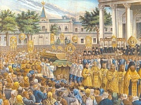 19 июля / 1 августа 1903 года состоялось одно из событий, не перестающих волновать сердца людей, – канонизация прп. Серафима Саровского через 70 лет после его кончины. В день рождения святого с великим торжеством были открыты его мощи и помещены в приготовленную раку. Это долгожданное событие сопровождалось многими чудесными исцелениями больных, в большом количестве прибывших в Саров. Почитаемый очень широко еще при жизни, преподобный Серафим становится одним из самых любимых святых православного русского народа, так же, как и преподобный Сергий Радонежский.
