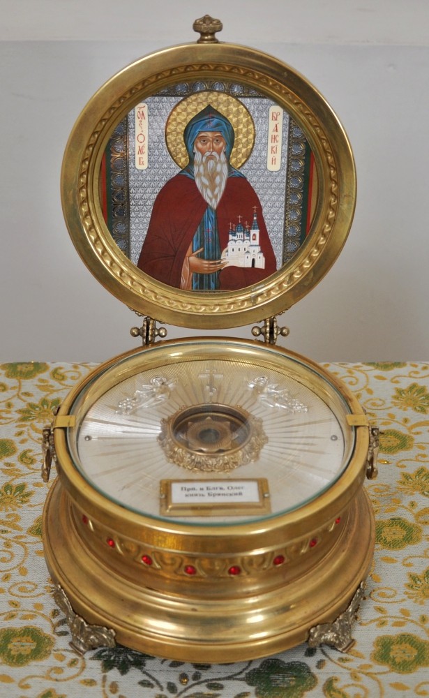 Благоверный Олег Романович, в крещении Леонтий, князь Брянский, был внуком князя Михаила Черниговского, замученного в Орде татарами. Святой Олег был равнодушен к богатству и мирской славе; его больше всего привлекала монашеская жизнь. Поэтому, уступив свой престол брату он постригся в монахи. При постриге его нарекли Василием. Святой Олег стал известен строгостью своей монашеской жизни. Он мирно скончался в своем монастыре около 1289 г. Его мощи почивали в Петропавловском Брянском монастыре, им построенном.