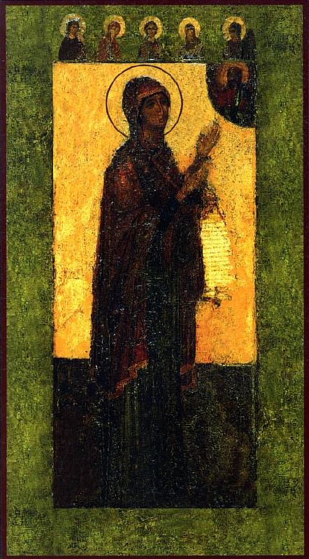 В 1155 году благоверный князь Андрей, переселяясь из Вышгорода в Суздальскую землю, взял с собой чудотворный образ Божией Матери, написанный евангелистом Лукою (впоследствии эта икона получила наименование Владимирской). В семи верстах от Владимира лошади, везшие киот с чудотворной иконой, остановились и не могли тронуться с места. Благоверный князь Андрей просил сопровождавшего его священника Николая совершить молебен перед иконой Божией Матери и долго со слезами молился перед чтимым образом. Затем он перешел в походный шатер, но не прекращал усердной молитвы. В это время ему явилась Пресвятая Богородица со свитком в правой руке и повелела благочестивому князю образ Ее, принесенный из Вышгорода, поставить во Владимире, а на месте Ее чудесного явления построить храм и святую обитель. Потом Она молитвенно подняла руки к небу, принимая благословение Христа Спасителя, Который явился в это время над землей, благословил Ее, и видение исчезло.