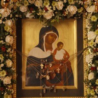 Торжествующе ныне радостно во храме Твоем, Пречистая, и Твоему припадающе честному образу, молим Тя умиленно: сотвори нас достойны быти лика празднующих в торжестве избранных Сына Твоего рабов.