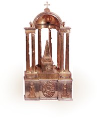 Выполнена по эскизам архитектора М.Ф. Казакова. Конец XVIII — начало XIX века. Серебро, золочение. Дарохранительница – это священный сосуд, в котором хранятся Тело и Кровь Христовы. В православных храмах дарохранительница хранится в алтаре на престоле и носит название кивот.