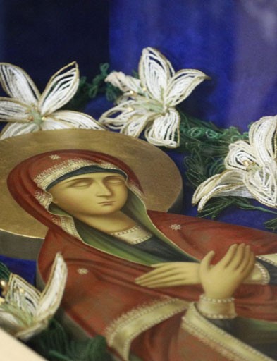 Во многих храмах и монастырях можно увидеть небольшие деревянные, вырезанные по контуру плоские фигуры, на которых изображена лежащая Божия Матерь с закрытыми глазами и сложенными на груди руками.