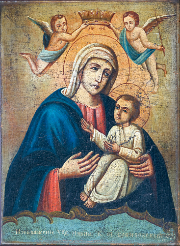 Богоматерь изображена на этой иконе в строго византийском стиле; изображение сделано на холсте, наклеенном на кипарисную доску. Живопись от времени потемнела. Изображение Богородицы поясное, правая рука приподнята. Одежда полностью покрывает главу, спускаясь на плечи и руки. Предвечный Младенец с левой стороны поддерживается рукою Пречистой Его Матери. Персты правой руки Спасителя сложены для крестного знамения, в левой руке Он держит Евангелие. Главы Богоматери и Спасителя увенчаны коронами. Лики на иконах, отличающиеся величавостью выражения, по временам видны отчетливо и ясно, а иногда бывают настолько туманны, что их трудно бывает рассмотреть. Помещается этот образ в иконостасе, над царскими вратами.