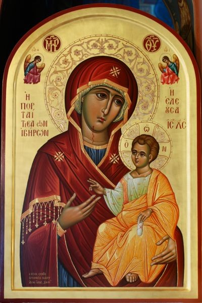 Иверская икона (которая сейчас хранится на Афоне) в IX веке находилась у одной благочестивой вдовы, жившей близ города Никеи. При императоре Феофиле (829–842) иконоборцы, уничтожавшие святые иконы, пришли в дом этой христианки, и один воин копьем ударил по образу Богородицы. Тотчас из пораженного места потекла кровь. Вдова, боясь уничтожения святыни, пообещала императорским воинам деньги и просила их до утра не трогать икону. Когда они ушли, женщина вместе с сыном (впоследствии афонским иноком), для сохранения святой иконы опустила ее в море. Икона, стоя на воде, приплыла к Афону. Афонские иноки, несколько дней видя в море огненный столп, восходящий до неба, пришли к берегу и нашли святой образ, стоящий на воде. После молебна о даровании монастырю явившейся святыни благочестивый инок Иверского монастыря святой Гавриил Грузин (память 12 июля), по повелению Божией Матери, явившейся ему во сне, пошел по воде, принял святую икону и поставил в храме. Однако на следующий день икона была обретена не в храме, а над воротами обители. Так повторялось несколько раз, пока Пресвятая Дева не открыла святому Гавриилу Свою волю во сне, сказав, что не желает быть хранимой иноками, а хочет быть их Хранительницей. После этого образ был поставлен над монастырскими воротами, где находится и по сей день. Поэтому святая икона называется Портаитиссою, Вратарницею.