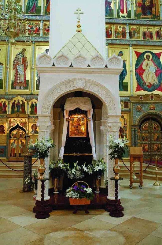 Возсиявши всей вселенней, яко дивный благоуханный храм Божий, исполненный Божественныя славы и благодати, о, Дево Мати Пречистая, Царица небесная, Царица человеков и ангелов, апостолов и мучеников; буди и нам путеводною звездою во мраке скорбных дней наших, возвесели сердца наша, тьмою страстей объятыя; восстави силы наши во страстях иссякшия; умножи веру нашу, крепи надежду нашу и согрей огнем пламенныя любви ожесточенныя и озлобленныя души наша, да зовем Ти со умилением: