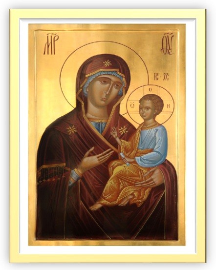 Всем ве́рным уте́шительно есть взира́ти на святу́ю ико́ну Твою́, Влады́чице, на нейже зрим Тя, на руку́ Твое́ю держа́щую Предве́чнаго Младе́нца Го́спода на́шего Иису́са Христа́, Ему́же покланя́ющеся боголе́пно, я́ко Творцу́ и Бо́гу на́шему, Тебе́, и́стинней Богоро́дице, умиле́нно глаго́лем: