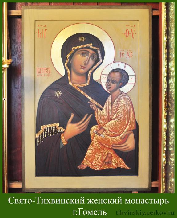 Тихвинская икона Божией Матери, по преданию, одна из икон, написанных святым апостолом и Евангелистом Лукой. В V в. из Иерусалима была перенесена в Константинополь, где для нее был построен Влахернский храм. В 1383 году, за 70 лет до взятия турками Константинополя, икона исчезла из храма и в лучезарном свете явилась над водами Ладожского озера. Чудесно носимая с места на место, она остановилась близ города Тихвина. На месте явления иконы был построен деревянный храм в честь Успения Богородицы. Усердием великого князя Василия Ивановича (1505–1533) вместо деревянного храма был возведен каменный. В 1560 году по приказу царя Иоанна Грозного при храме был устроен мужской монастырь, обнесенный каменной стеной. В 1613–1614 годах шведские войска, захватив Новгород, не раз пытались уничтожить монастырь, но заступлением Божией Матери обитель была спасена. Так, однажды, в виду приближавшегося шведского войска, иноки решили бежать из монастыря, взяв чудотворную икону, но не могли сдвинуть ее с места. Это чудо остановило малодушных, и они остались в монастыре, уповая на защиту Божией Матери. Незначительные по числу защитники монастыря успешно отражали атаки намного превосходивших их сил противника. Наступающим шведам то представлялась многочисленная рать русских, идущая от Москвы, то какое-то небесное воинство, и они обращались в бегство. После чудесной победы над шведами в монастырь прибыли царские послы. Сняв список с чудотворной иконы, они отправились в деревню Столбово, в 50 верстах от Тихвина, где 10 февраля 1617 года был заключен мир со шведами. Главною порукою мира с русской стороны был принесенный список с чудотворной иконы. Впоследствии этот список был принесен в Москву и поставлен в Успенском соборе, а затем по просьбе новгородцев, участников войны со шведами, отправлен в Новгород и поставлен в Софийском соборе. Так с начала XVII века началось всероссийское почитание Тихвинской иконы Божьей Матери.В ХХ веке, в годы лихолетья и жестоких гонений на Церковь Божию монастырь был закрыт. В 1944 году будущий архиепископ Чикагский и Миннеаполисский Иоанн (Гарклавс) и мирянин по имени Сергий (впоследствии его приёмный сын), спасая чудотворную Тихвинскую икону, увезли её в Европу, а затем – в США. Перед своей кончиной в 1982 году архиепископ Иоанн завещал своему приёмному сыну протоиерею Сергию Гарклавсу заботиться об иконе Богородицы Тихвинская и вернуть её России тогда, когда в стране изменится отношение светской власти к Церкви и будет восстановлен Тихвинский монастырь. Торжественное возвращение святыни произошло в 2004 году: 8 июля 2004 года, после 60-летнего отсутствия, святыня вернулась в Тихвинский Богородичный Успенский монастырь, который избрала для своего постоянного пребывания шесть столетий назад. Списки ее находятся во многих храмах и монастырях России